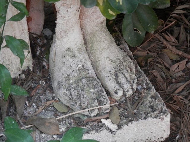 Cuando estos pies, asomando en uno de los parterres del jardín de una amiga, pensé que ahí se ocultada una escultura, retiré las ramas de una chiflera con interés, pero cual fue mi sorpresa al encontrarme solo los pies. Reconozco que la imagen me impresionó y por esa razón no dude en fotografiarlos, preguntándome porqué mi amiga los mantenía ahí.